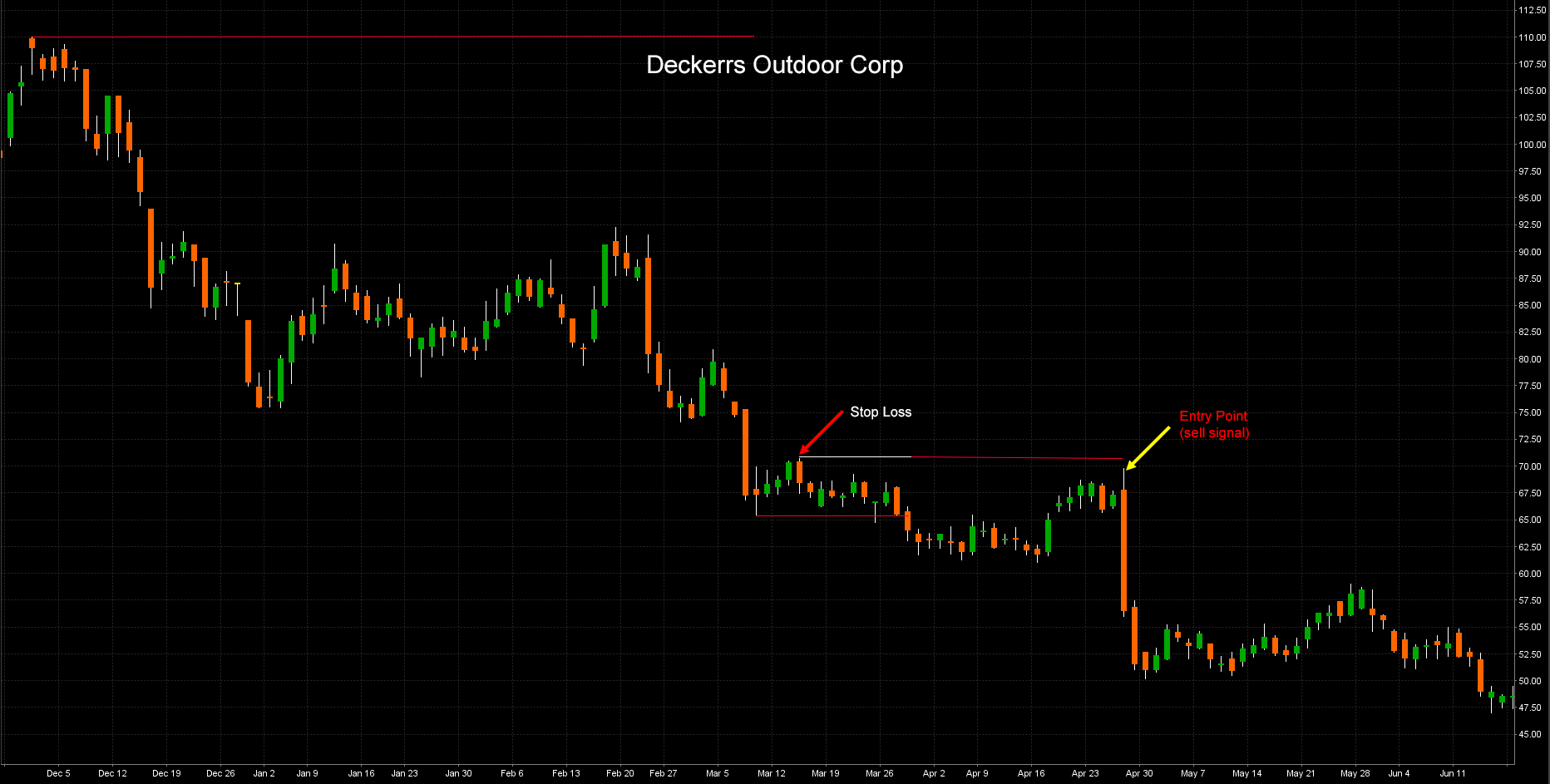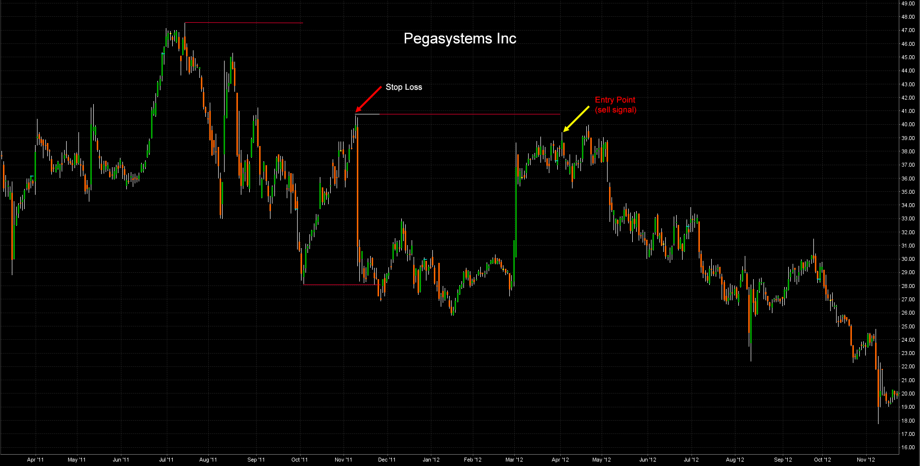 Here are 2 instances YardCharts has identified where the Horizontal Resistance pattern led to successful trades, with the stock price decreasing at least threefold the distance to the stop loss from the entry point without triggering the stop loss.