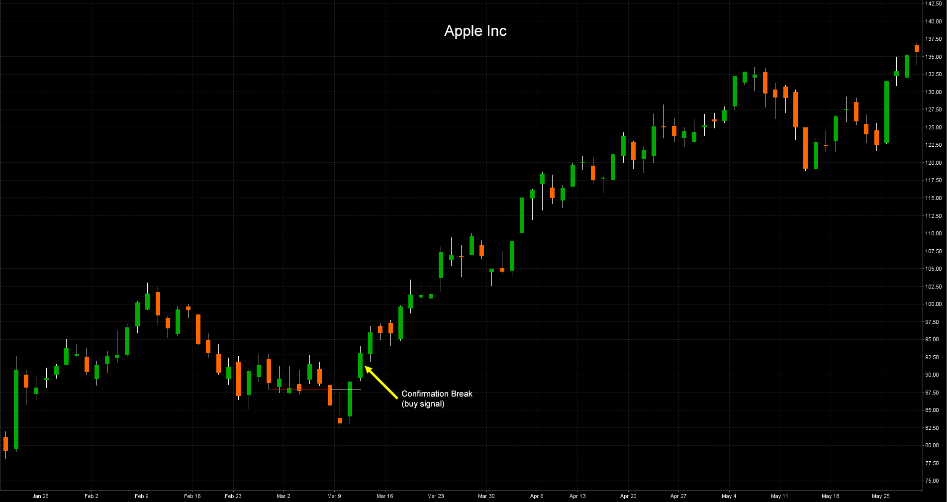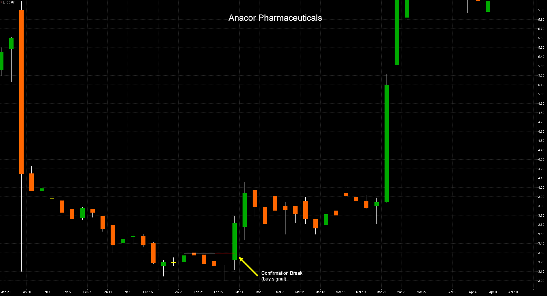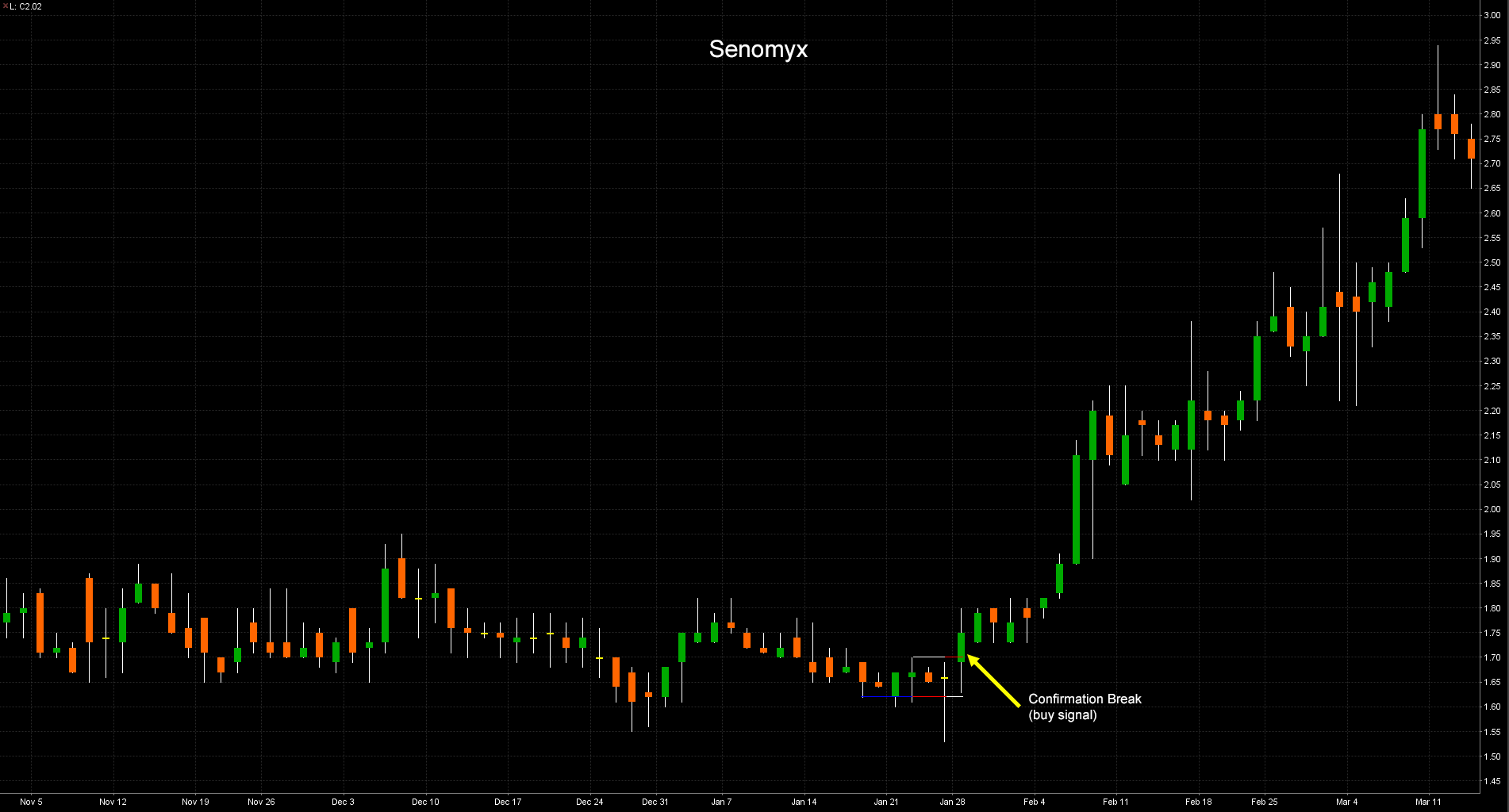Here are 4 instances YardCharts has identified Bottom Reversal patterns where, post-entry, the stock price increased by at least three times the height of the trading range without hitting the stop loss below the range's lower band.